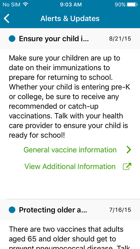 The only section that contains different content for providers, pharmacists, and patients is Alerts & Updates. However, some of the content still applies to all roles. This section contains the guidelines with brief overview and links to vaccine information in the app and additional information on respectable websites.