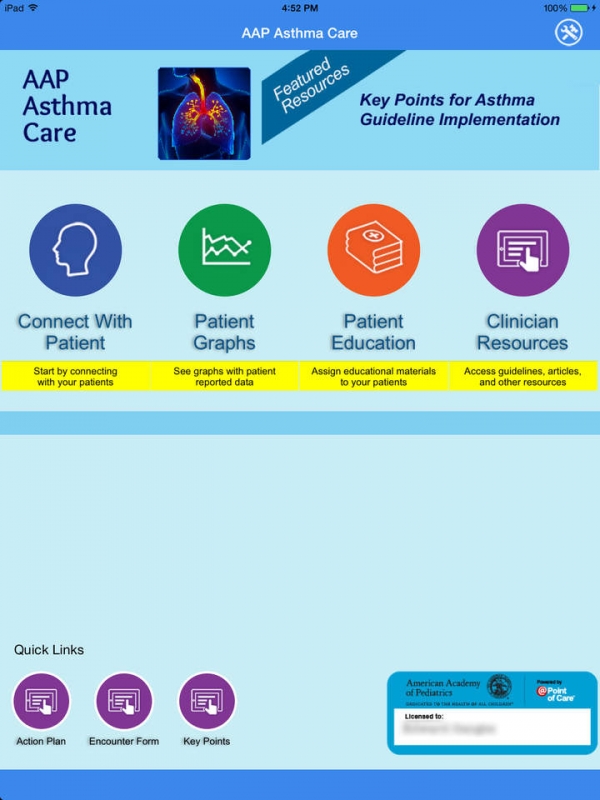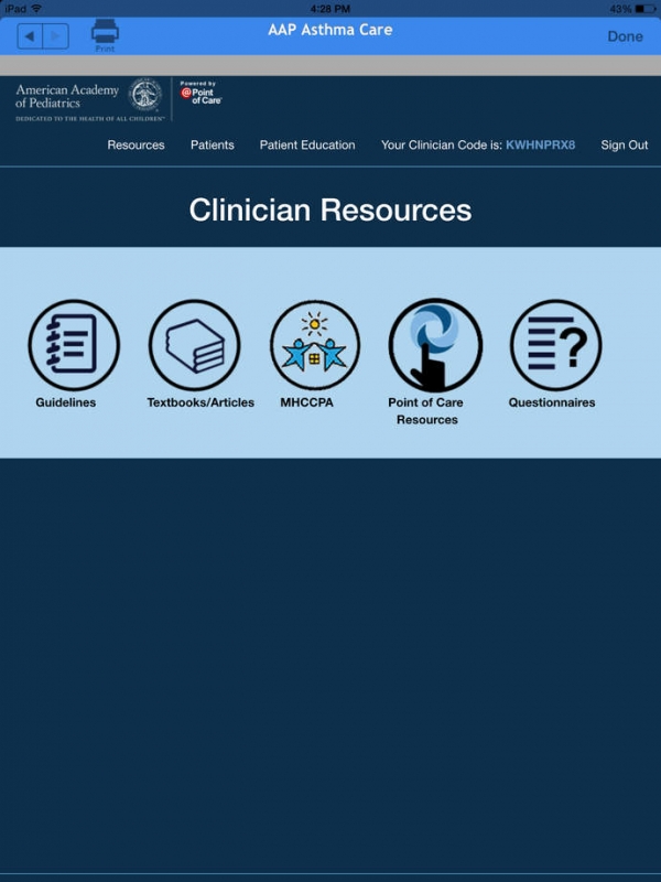 AAP Asthma Care for Clinicians is a comprehensive review of various resources that are useful for clinicians to manage their asthmatic patients. This product is designed by the American Academy of Pediatrics and is one of several apps released by the AAP. Using AAP Asthma Care for Clinicians, a user will have access to a range of tools such as levels of control of asthmatic symptoms, medication efficacy, patient education, and a chance to correspond with patients directly that may be suffering from an asthma attack.