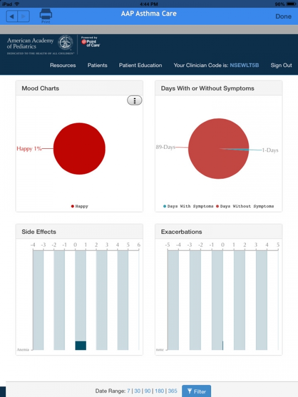The next tab that is useful to a clinician is the patient graphs that can quantify the number of days each month that patients have symptoms of dyspnea. This is important in management because it may be hard for patients to recall on a monthly visit the number of times that they had problems sleeping at night or asthma attacks. As a result, clinicians often have to accept estimations and ask how many times a week a patient may have problems of breathing. This can lead to problems managing patients if you’re dealing with an infant or adult patient with poor memory recall and can result in insufficient medication to treat the disease. Having a diary that can track symptoms daily can lead to making sure there is a resolution of symptoms sooner for the patients so stronger medications can be used instead.