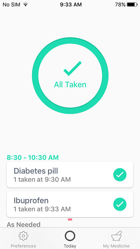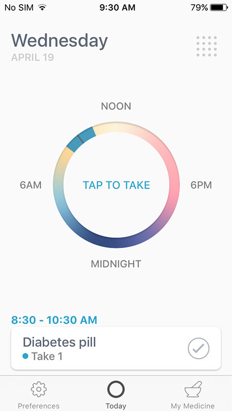 To notify the app that you've taken the medication, you just have to tap a circle, which changes the color to green and adds a check mark. To see your weekly and monthly drug use, you can tap on icon that resembles pill pack and see a calendar showing all days you stayed adherent and marking them green.