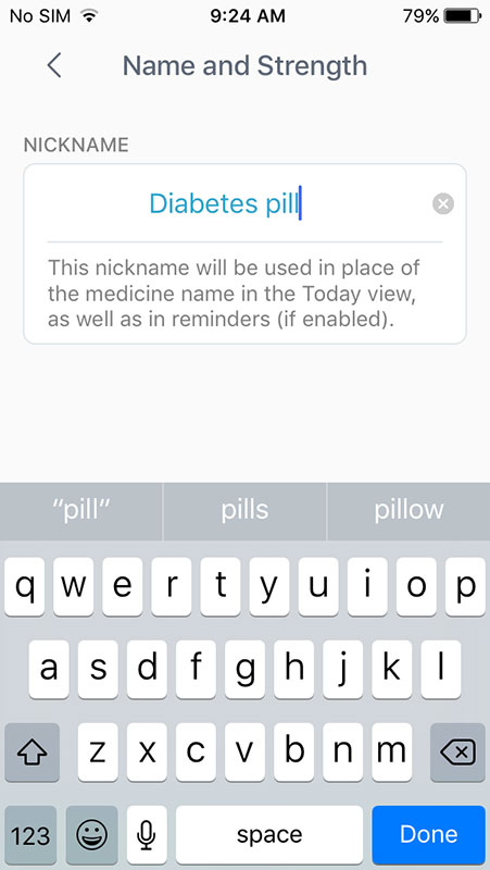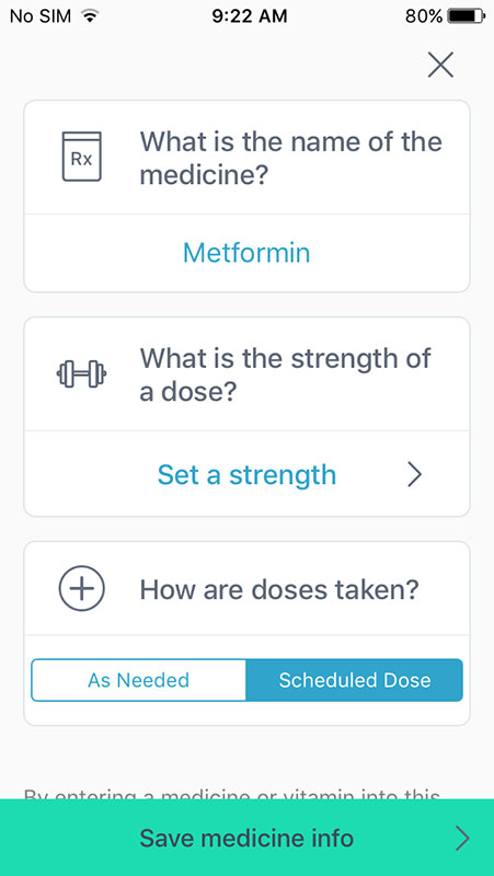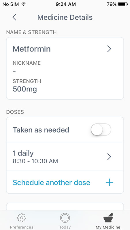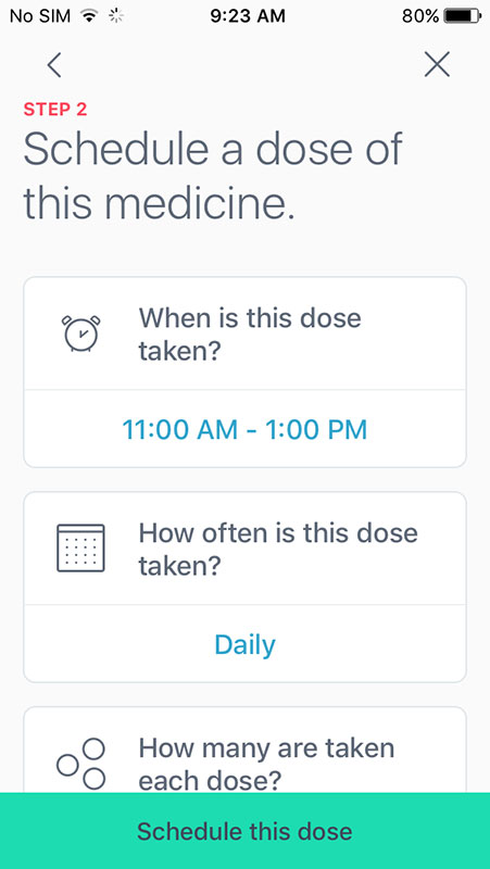 After choosing the medication from the list, you can choose the dosage from a list, which is provided for each drug differently, or you can simply enter a custom dose (if stated on prescription). Once the dose strength is chosen, users need to choose how they take the drug, i.e. scheduled or as needed.