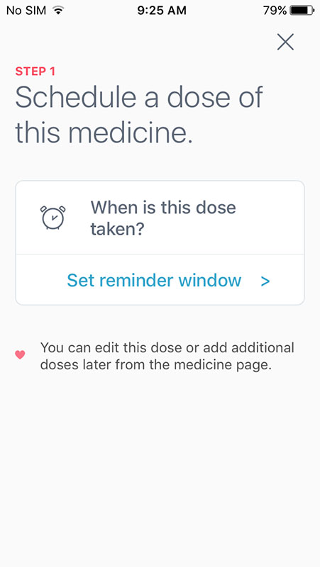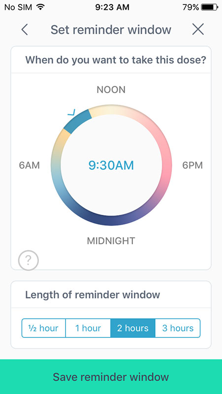 Users then choose the time(s) at which the dose should be taken. This part is done quite intuitively with a circle that users can use as a sort of dial to set the time of the day. However, the circle is too small and easily covered by finger while you're "dialing", so times cannot be seen, and you might need to repeat this action until the right time is set. Some, less patient users may find this part frustrating. While it's certainly nice looking, there should be another option enabling users to enter the time manually.
