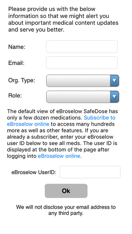 The app is free to download and use. However, the default version of SafeDosePro app only includes few dozen medications. To access hundreds of more medications, as well as additional features, users are required to subscribe to eBroselow Online to receive UserID they can use during the registration for full access to all app's features.