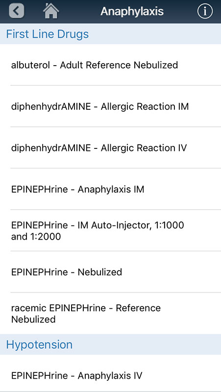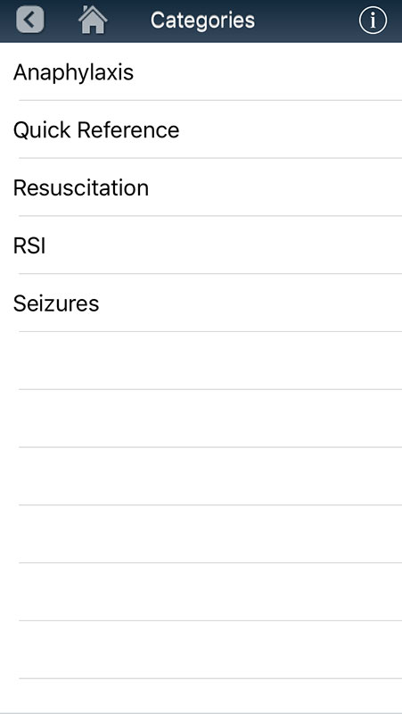 Finally, users can look up the medications by categories, including Anaphylaxis, Quick Reference, Resuscitation, RSI, and Seizures. By clicking on a category, the app then features a list of medications used in an emergency setting for a particular case. The number of categories is also limited in the free version of the app and expands once the users subscribe.