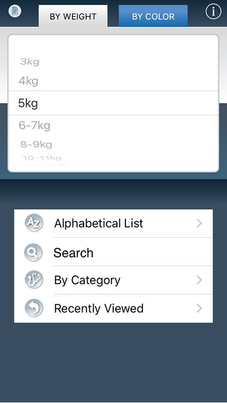 The selection of weight ranges from 3 kg to 130 kg, and if you use By Color system, weights from 6 to 36 kg will be displayed in colors as on Broselow Tape (3–5 kg will be displayed grey). Unfortunately, there's no option to switch to imperial units (lbs).
