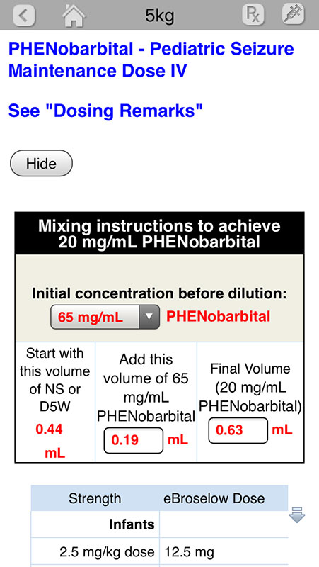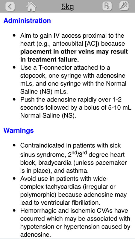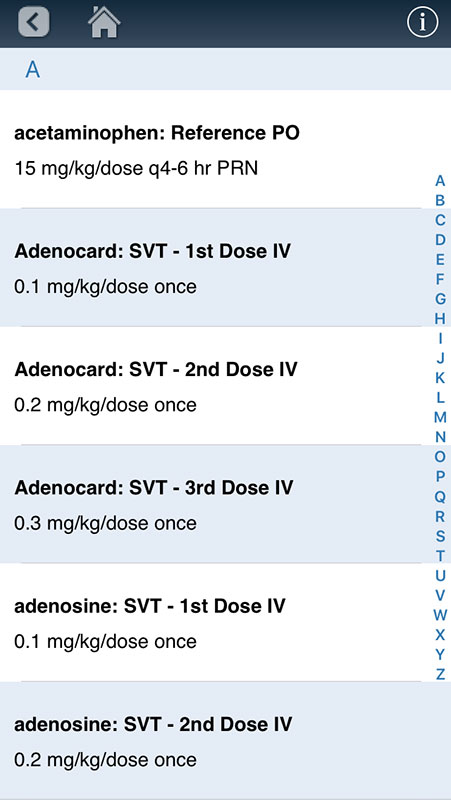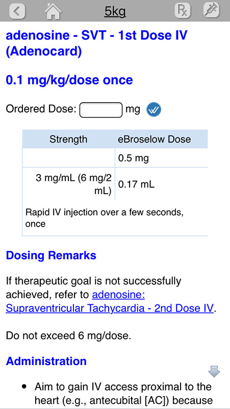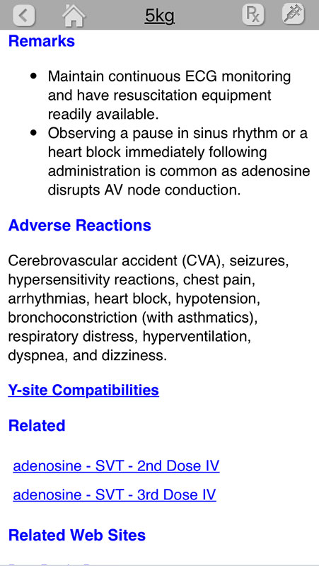 Selecting a drug from the list opens a new page with more information about selected drug, including dosing recommendations, calculations based on available drug concentrations (not available for all medications in the list), guidance on the drug administration, additional notes about the selected medication, such as warnings and adverse reactions, and links to related websites where users can get more information.
