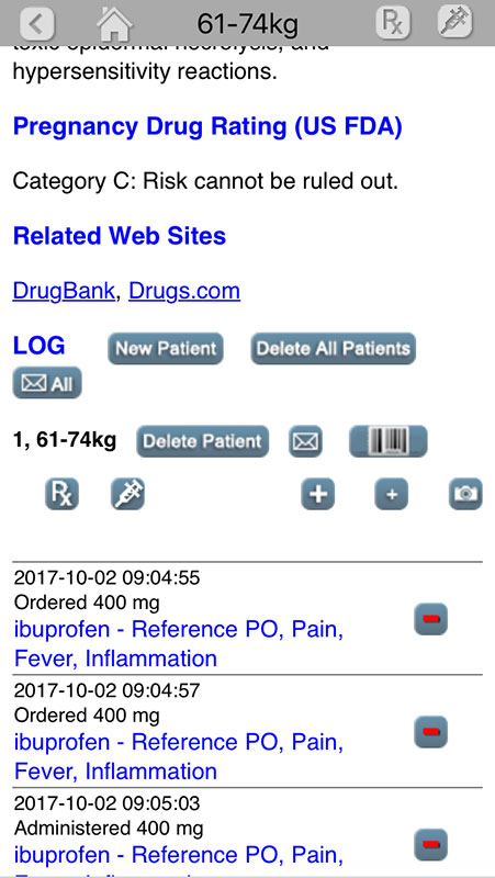Once you've created a patient, you can head to drug list to log the medications for that patient. There are a few options for each patient and medication. You can order and administer the drug by selecting the Rx and Syringe button, and then log that dose's date and time. As you navigate through the app, your patient/medication log will be visible at the bottom of the page.
