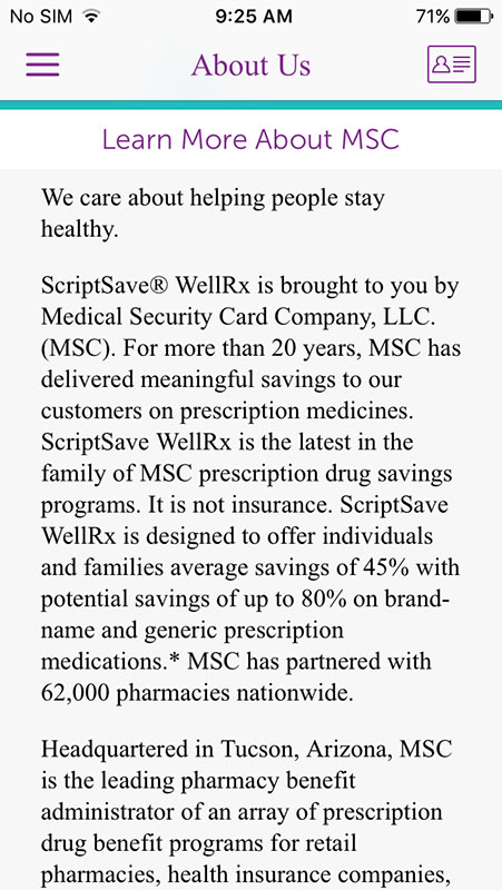 ScriptSave WellRx mobile app, developed by Arizona-based Medical Security Card Company, helps insured, uninsured and under-insured individuals search for savings on prescription medicines and compare prices at local pharmacies.