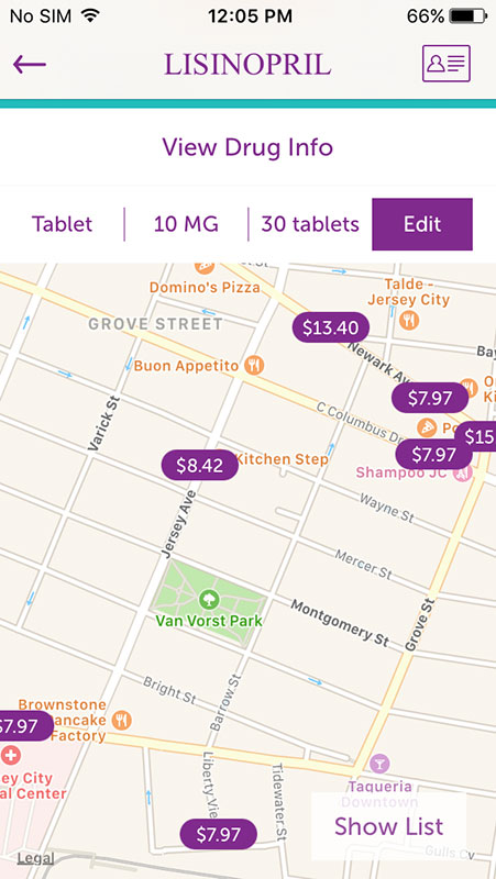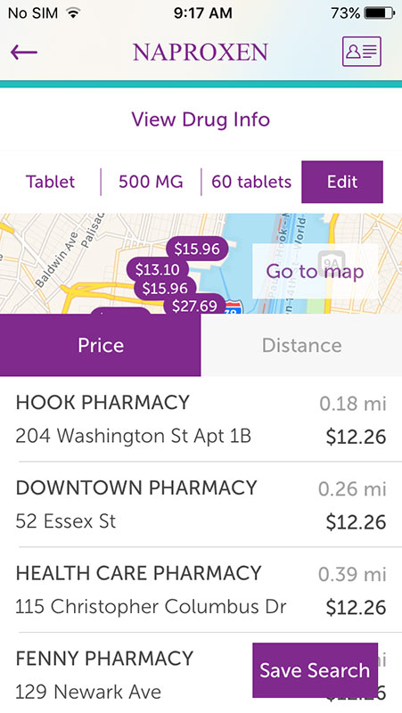 All pharmacies will be listed in the new screen that opens after you tap on Search button. You can sort them by price (from lowest to biggest) or distance (closest to you would be listed first). Either way you chose, you'd see both information alongside the pharmacy name and address.