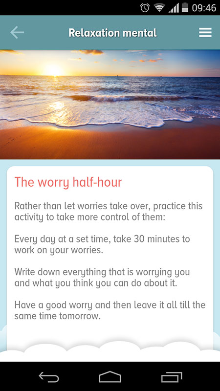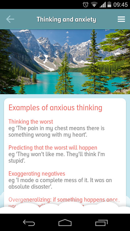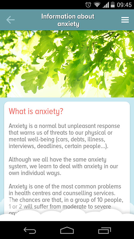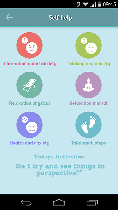 This app offers a range of techniques for people who want to learn how to manage their anxiety, with the help of established self-help methods, combined with high standards of usability to provide an engaging, flexible, and practical resource.