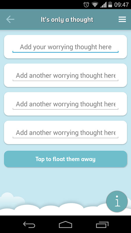 The app also allows users to save their favorite anxiety techniques for quicker access by building their own Anxiety Toolkit of SAM resources they can use for regular practice in managing anxiety situations. However, the app is lacking other ways of personalization. Here's one example. In Relaxation Mental, there's an option called 'It's only a thought' where you can type out the anxiety-inducing thoughts, that float away once you tap on the button. The app doesn't save these thoughts for later use. Whether this is done intentional (once they float away, negative thoughts shouldn't come back) or not, I'm not sure, but getting rid of negative thoughts is not as simple as 'one tap makes them float away.'