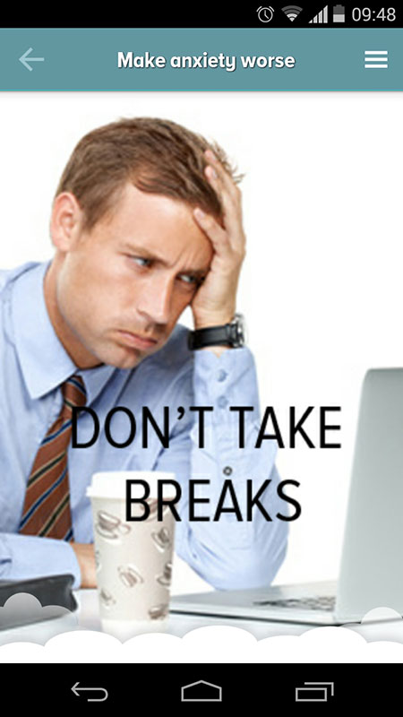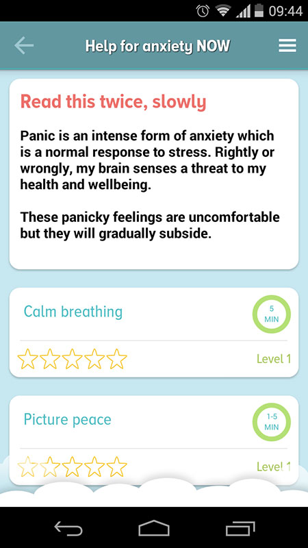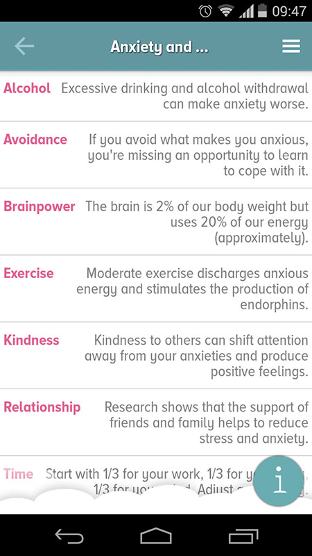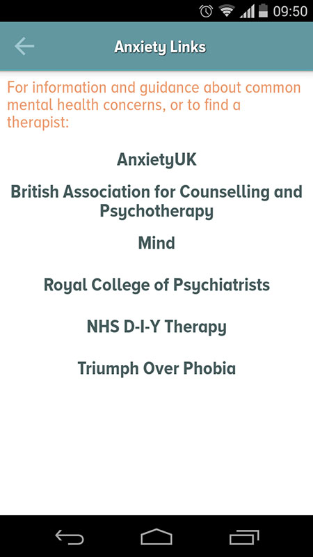 However, the textual info provided within the app lacks the links to sources of specific techniques. But, this isn't a big drawback, because the content is backed by a psychology department at UWE Bristol, and based on their own clinical experiences, which gives this app a legitimacy over other anxiety apps.