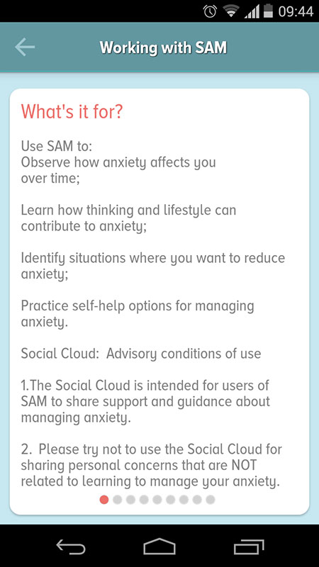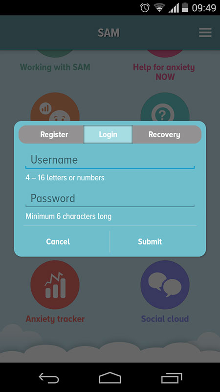 The app also provides a social component through "social support", which is quite basic. You're allowed to log in, write posts, or to view and reply to other SAM users posts. Users can use this option anonymously, as registering with personal information is entirely optional.