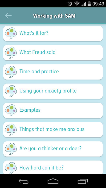 The SAM app though provides further anxiety links that give users option to expand their knowledge on common mental health concerns or to find a therapist.