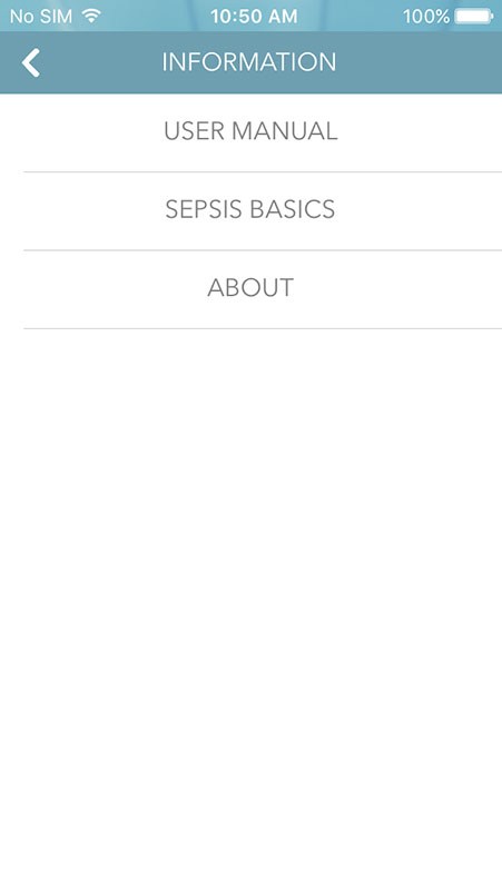 Before starting using their first time, users will be asked to review the Information section which provides a user manual for using the app, helps users understand sepsis basics, and gives more info about the developers.