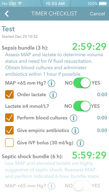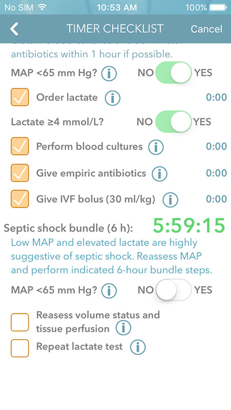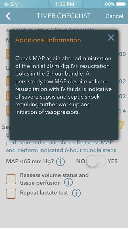 Each of the steps in the Timer Checklist has 'i' button which provides additional information about the particular step, i.e. blood cultures should be performed before antibiotics, cultures should be drawn from two sites, antibiotic regimen should cover Gram-negative and Gram-positive bacteria and comprise of double or triple antibiotic therapy, and so on.