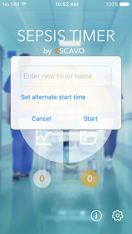 Sepsis Timer app has a simple and elegant interface that features a timer on the main page which allow users to start a new sepsis timer, view the list of active timers, view stats of completed timers, and view list of completed and archived timers.