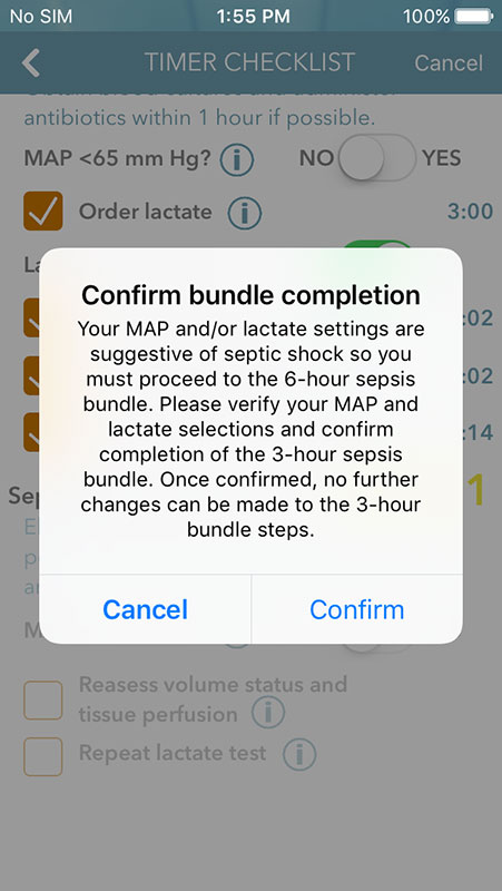 After completing and checking all steps, the app would prompt you to confirm bundle completion., which would mark the bundle as completed on the Active Sepsis Timers page.