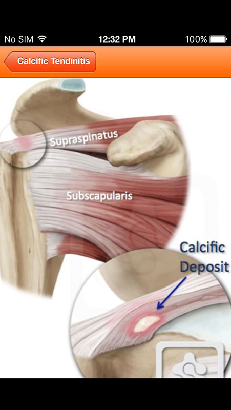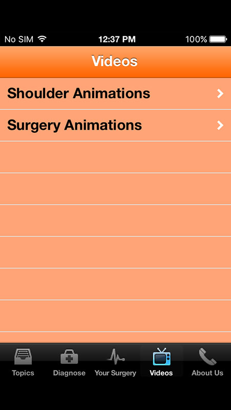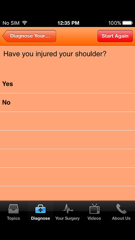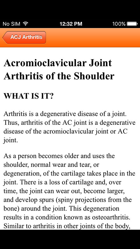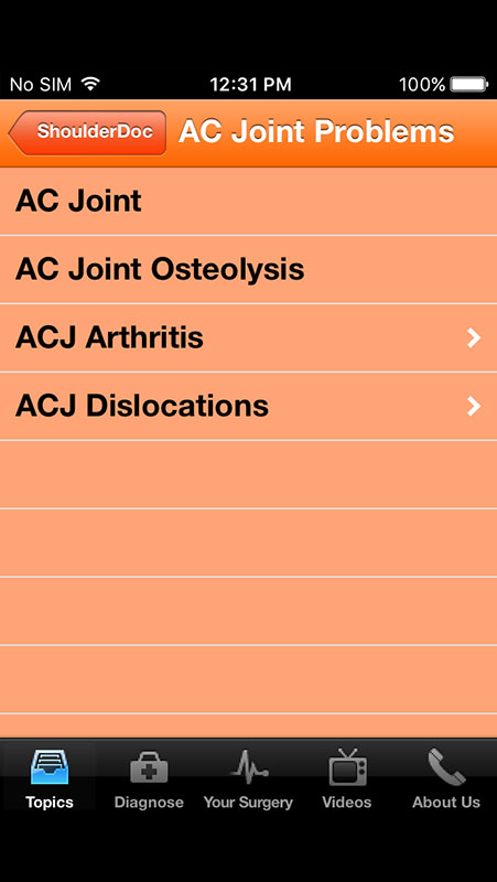 By default, the app opens to Topics page that lists the 25 common shoulder problems, from AC Joint Problems, Calcific Tendinitis, Frozen Shoulder, to Injections, Labral Tears, and Internal Impingement.