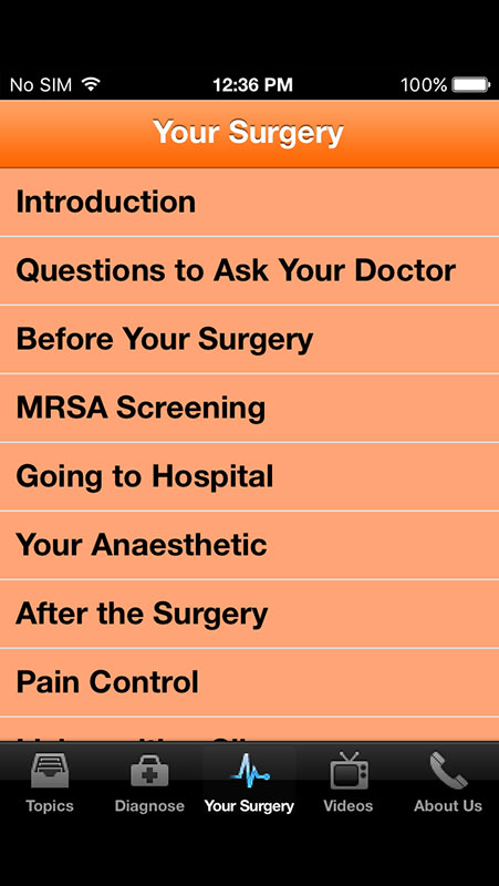 The remaining 4 categories are listed in the bottom menu, including Diagnose, Your Surgery, Videos, and About Us.