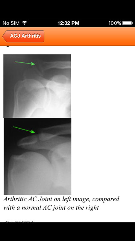 Tapping on the topic in the list opens a new page with more specific categories listed for each topic. For example, tapping on AC Joint Problems would open AC joint, AC Joint Osteolysis, ACJ Arthritis and ACJ Dislocations, or tapping on Frozen Shoulder would also reveal four sections, including Frozen Shoulder, Capsular Release, Exercises, and Arthrographic Distension/Hydrodilatation.