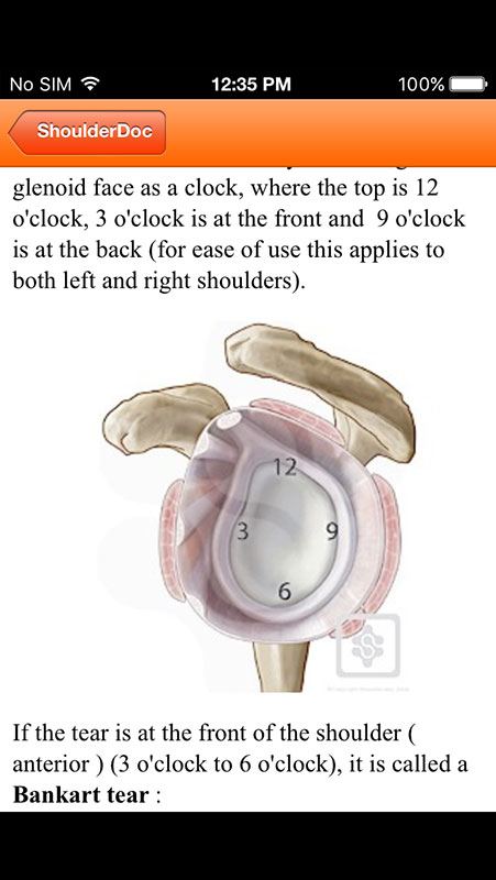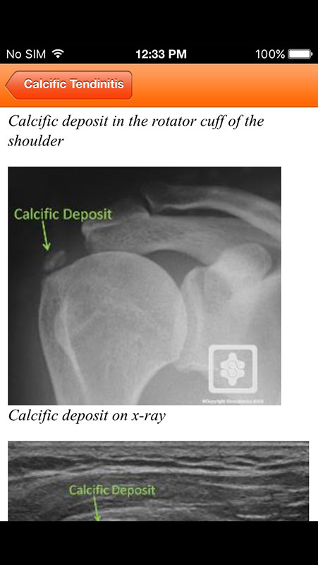 Information on each shoulder condition is comprehensive and well-referenced, and it's provided in a form of text, accompanied by annotated anatomy illustrations, photos, radiographs, and animations to help illustrate the condition.