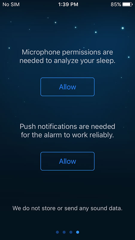 Upon starting the app it will take you through the brief tour, or more precisely few panels explaining how the app works. You'd need to enable the app to use your microphone and send notifications for alarm. After you've finished, you can proceed to the next page where you can set your alarm clock.