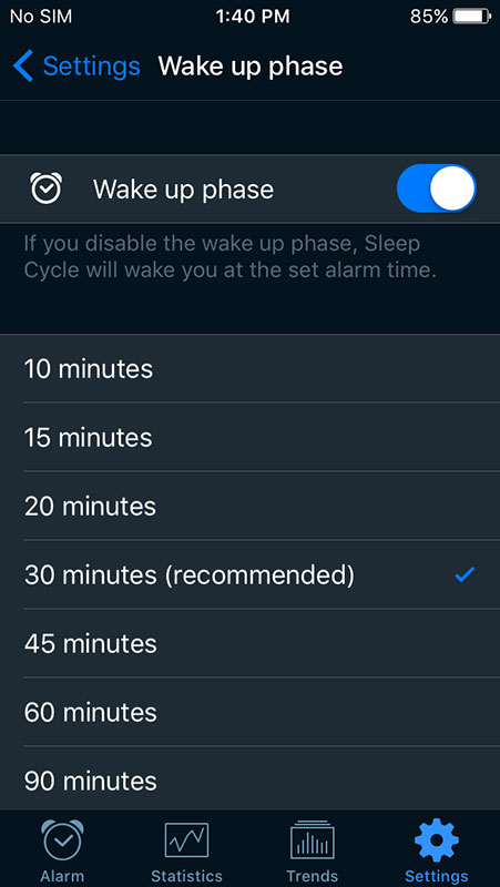 The app is no-frills when it comes to basic alarm functionality. You set the time you want to wake up at, and let the app take care of the rest, which happens 'under the hood' (of course, the app lets you fine tune some of the settings).