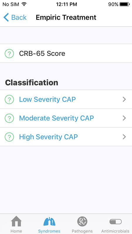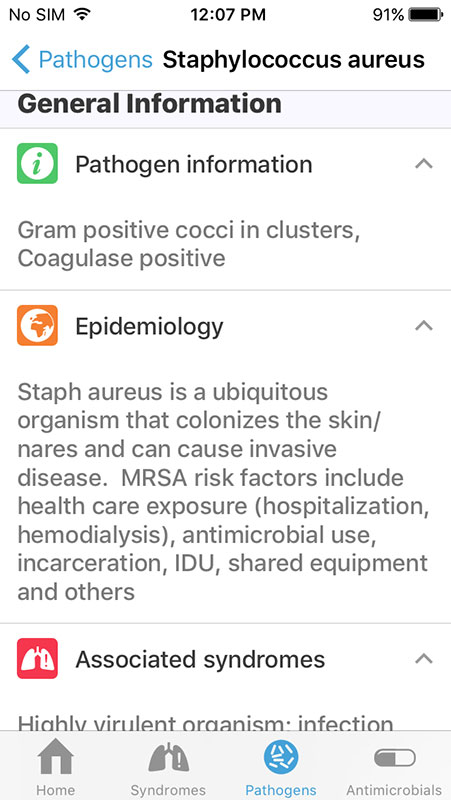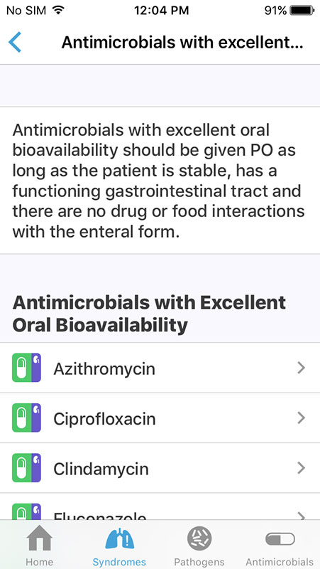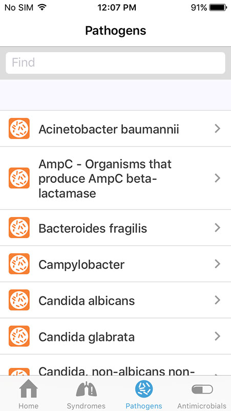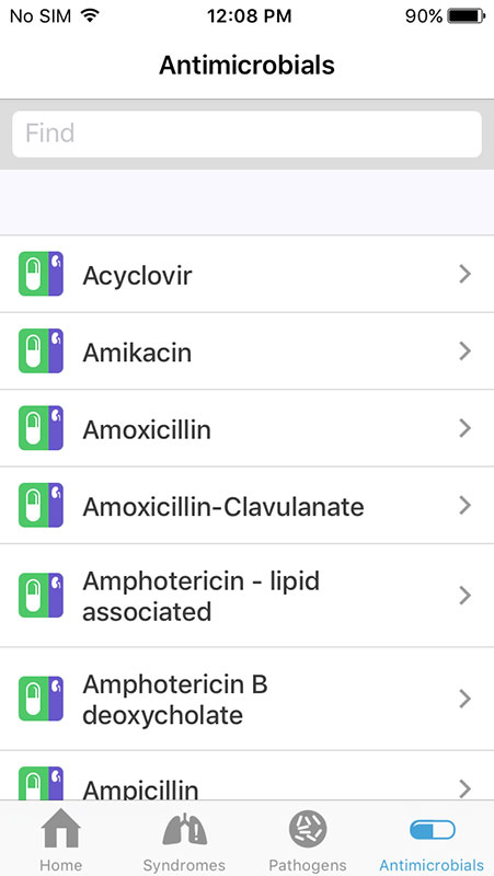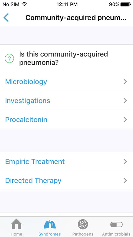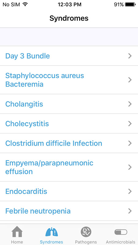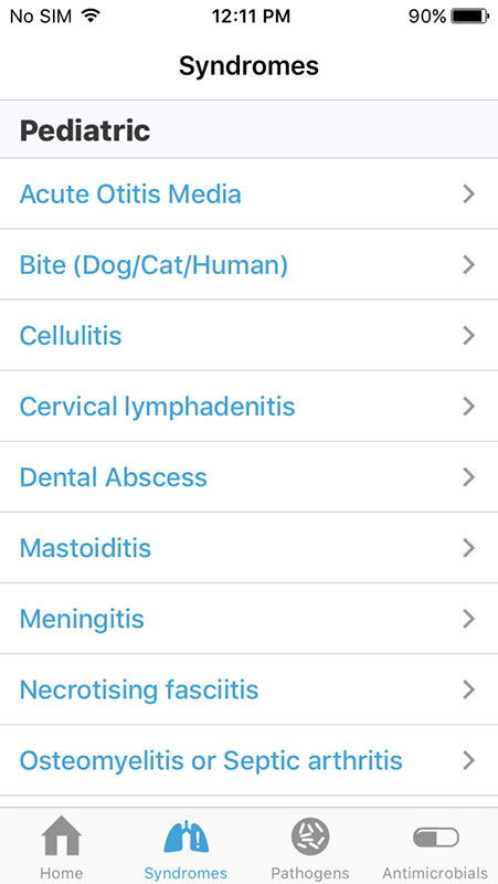 After the guideline has been downloaded, the app would open the main page featuring three options including Syndromes, Pathogens, and Antimicrobials. As you could guess, these sections contain antimicrobial guidelines based on medical conditions, pathogens that cause them, and the common antibiotic medications used in the treatment.