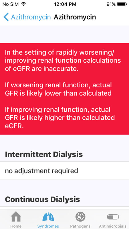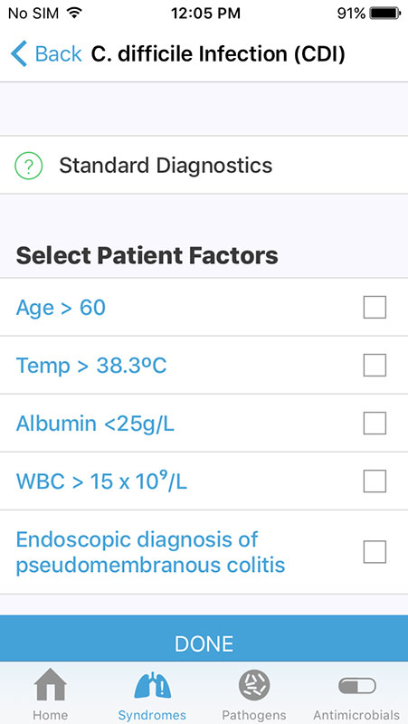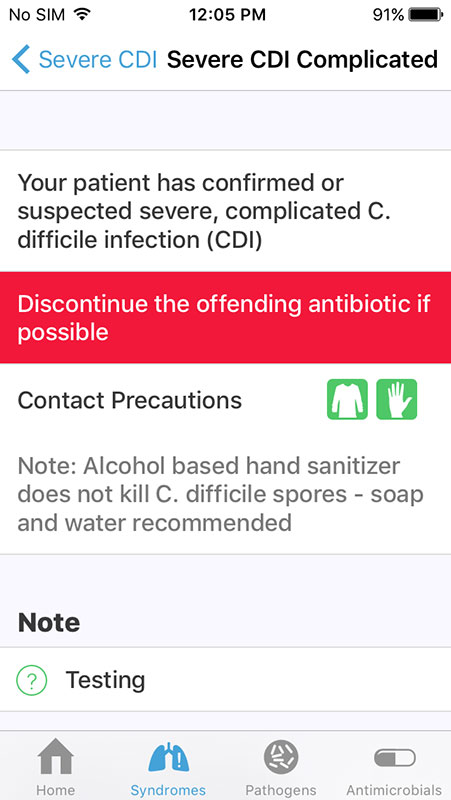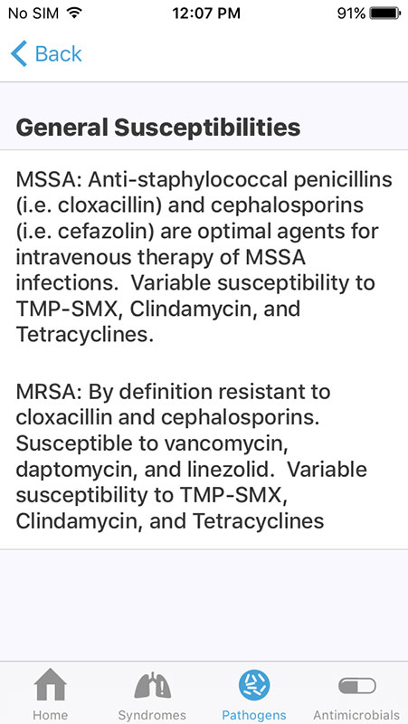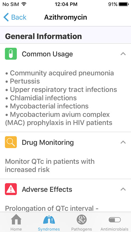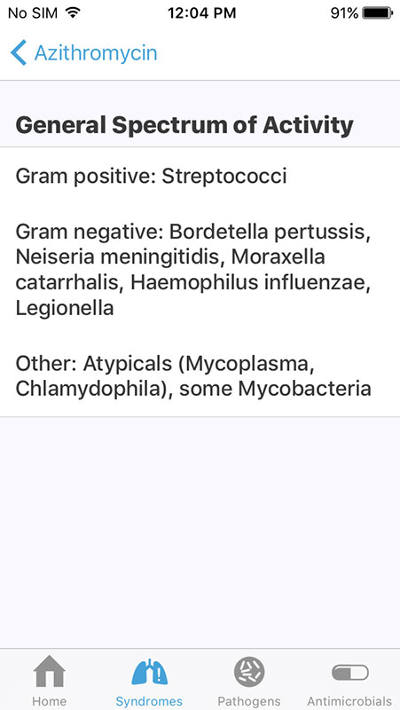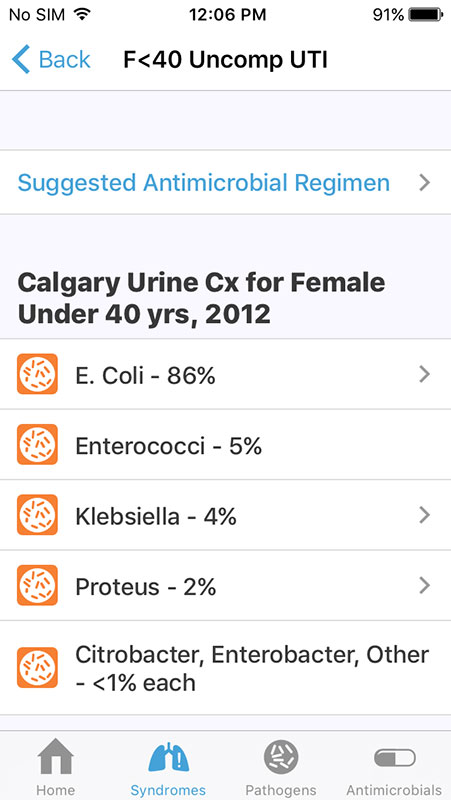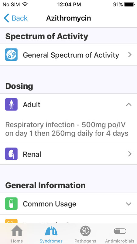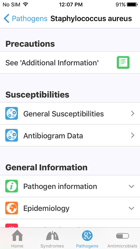 After the guideline has been downloaded, the app would open the main page featuring three options including Syndromes, Pathogens, and Antimicrobials. As you could guess, these sections contain antimicrobial guidelines based on medical conditions, pathogens that cause them, and the common antibiotic medications used in the treatment.