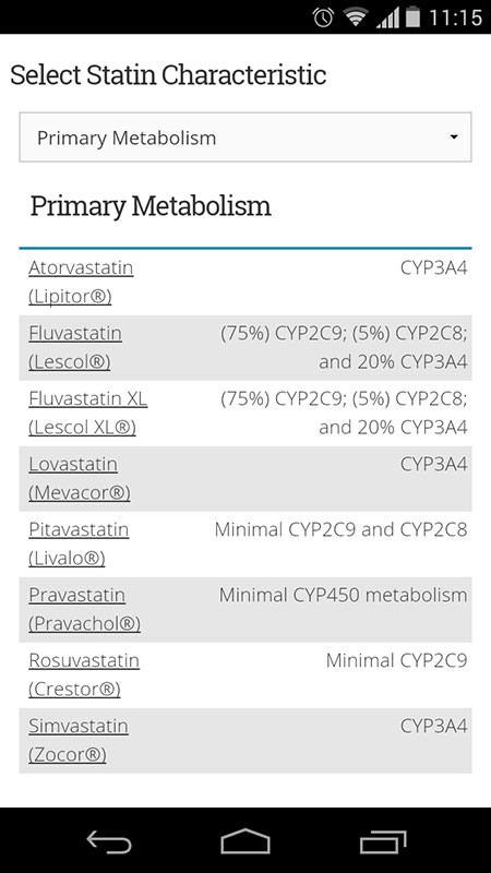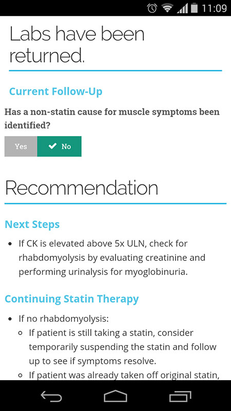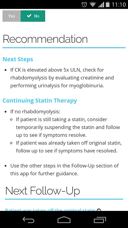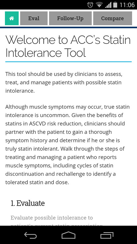 With a fair amount of practical and useful information about statin intolerance, this app is a great educational tool on how to perform the evaluation for statin myopathy and manage the patients with these symptoms. Information is given through three sections that guide users through the evaluation and follow-up process, but it could be improved with specifics on lab testing and follow-up intervals.