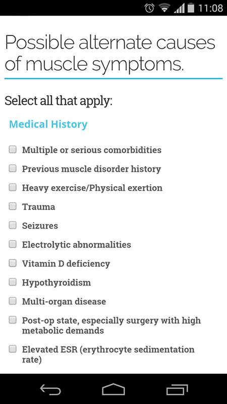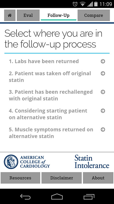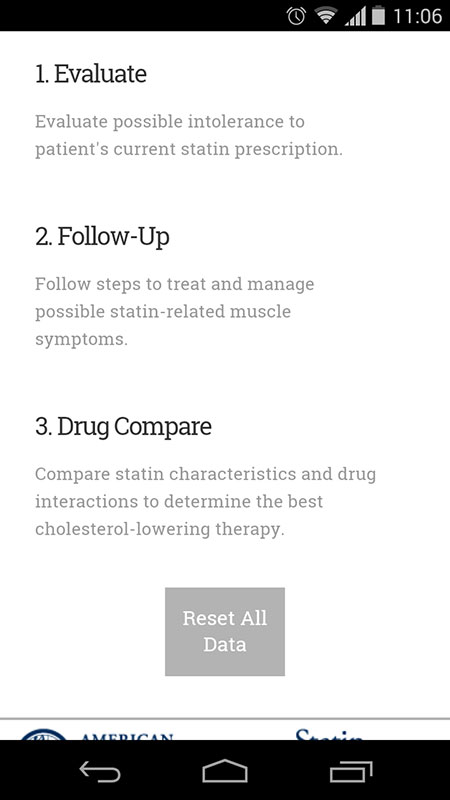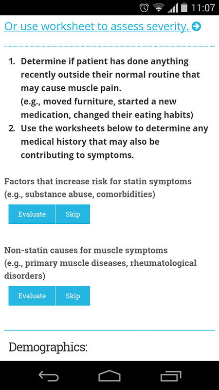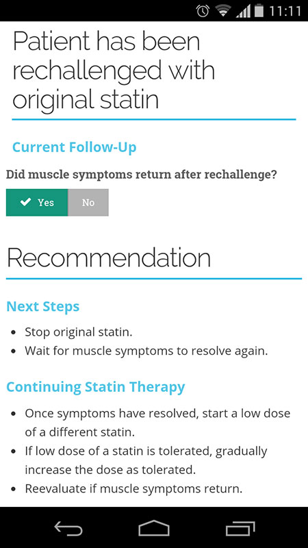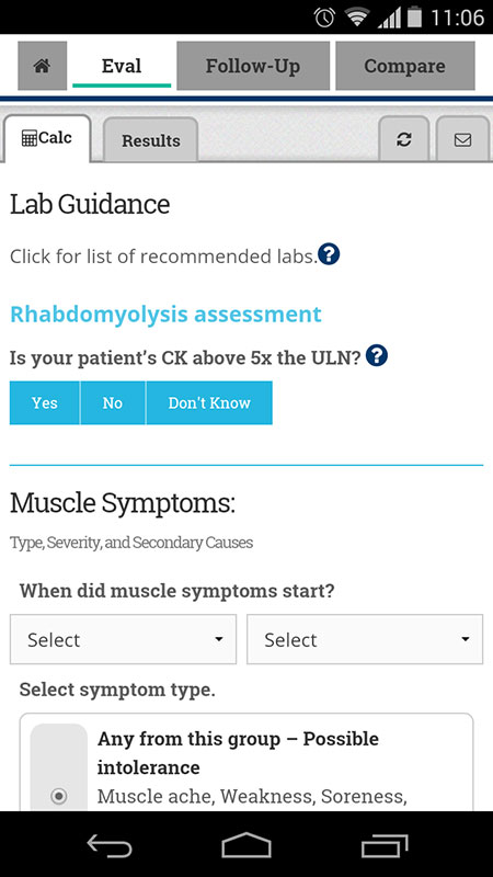 This app guides clinicians through the steps of treating and managing a patient who reports muscle symptoms, and through the patients' symptom history in order to determine if they are truly statin intolerant.
