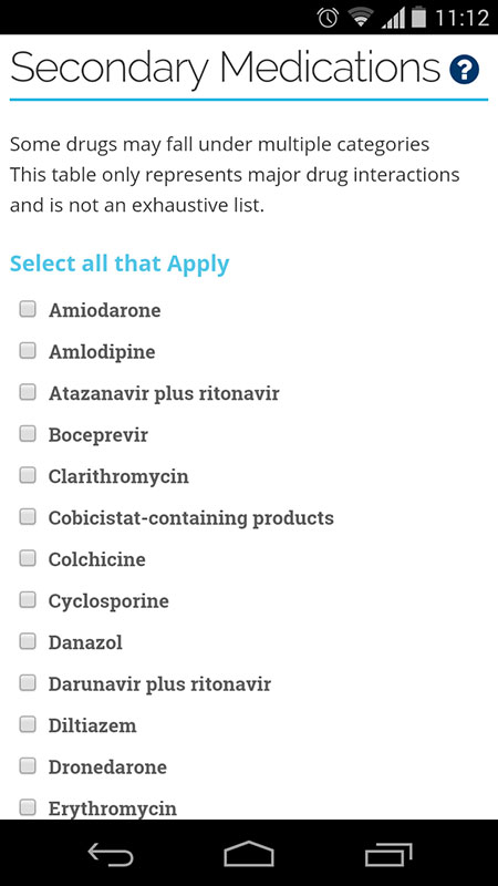 Probably the best part of Statin Intolerance app is its Compare option. It gives detailed information on a range of statins like doses, half-life, lipophilicity, optimal frequency, metabolic pathway, and more. Clinician may also select other medications that could potentially interact with statins. If there's an interaction with another drug the patient is taking, another variant of statin could be chosen as a better option to avoid the interactions. You see the secondary medications as a useful list with warning advice regarding statin usage and doses listed beside each variant of statin. However, this option would be even better if it's been made with a pinch of interaction thrown in, or as a side-by-side drug comparison option. Also, shareable patient information on statin side-effects would be useful addition.