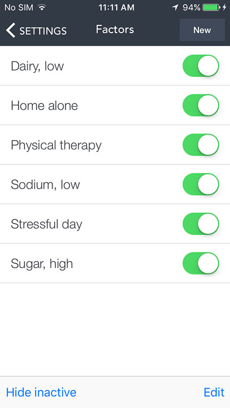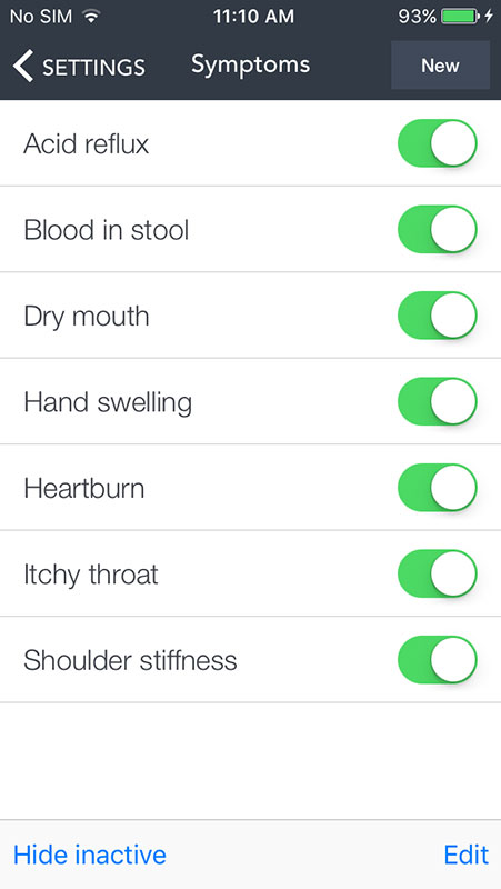 Adding new symptoms and factors after the initial setup may seem difficult, because there's no simple option to add them from their own screens. To add new symptoms and factors (and remove existing) you need to again tap on Settings, which allows you to access these two options and to deactivate or completely remove existing symptoms and factors, and to add new.