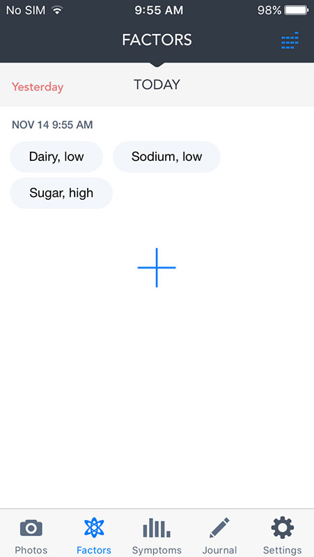 Upon starting the app, users will be prompted to choose up to 10 factors and up to 10 symptoms they'd like to track. Both offer a drop down list with numerous options users can choose from, to set up the best possible personal diary for themselves.