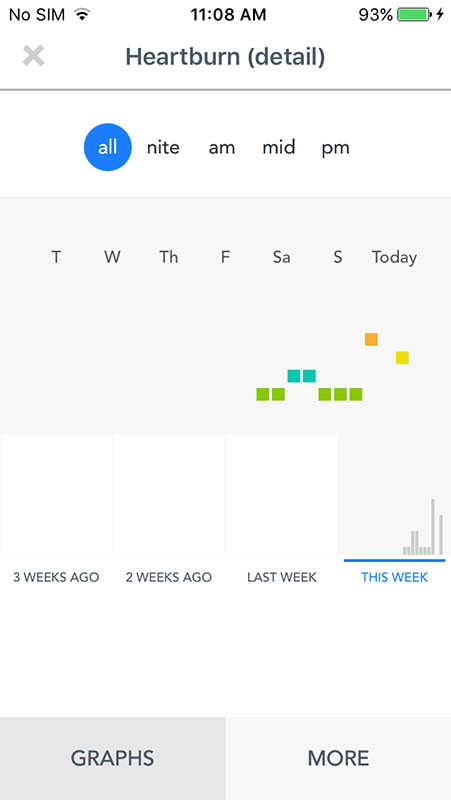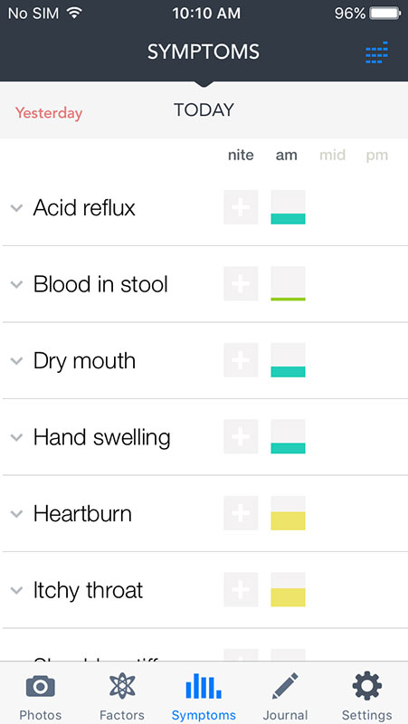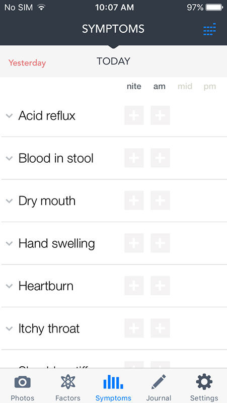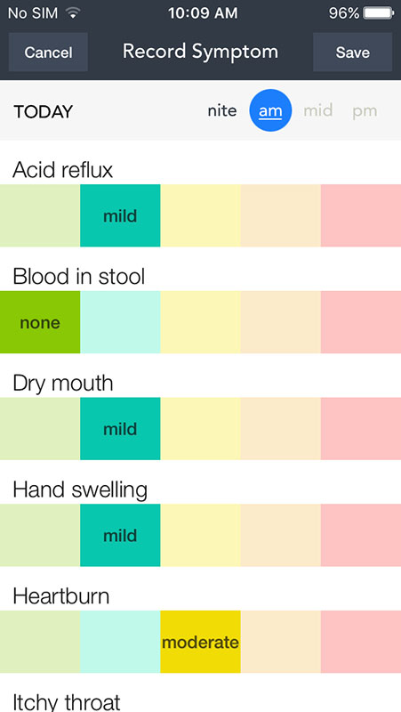 To record symptoms simply tap on plus sign beside the symptom name, which will open Record Symptom screen where you can add severity from None to Severe for different parts of the day, i.e. "nite", "am", "mid" and "pm".