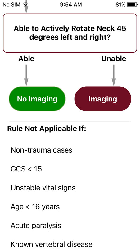 For example, you have a clinical scenario of 60 year old male with suspected spine injury, who fell from the chair (about 1 feet elevation), and who was able to sit in ER. The absence of midline c-spine tenderness is noted, but the patient couldn't rotate his necks 45 degrees left and right, so the imaging would be advised.