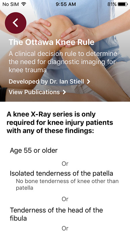 The app opens to the main screen with three existing rules that have been bundled together to provide better decision making support to medical providers, including Canadian C-Spine Rule, Ottawa Knee Rule and the Ottawa Ankle Rules.