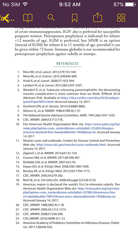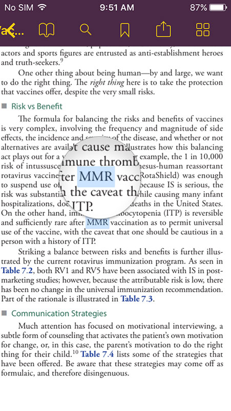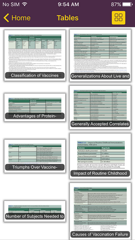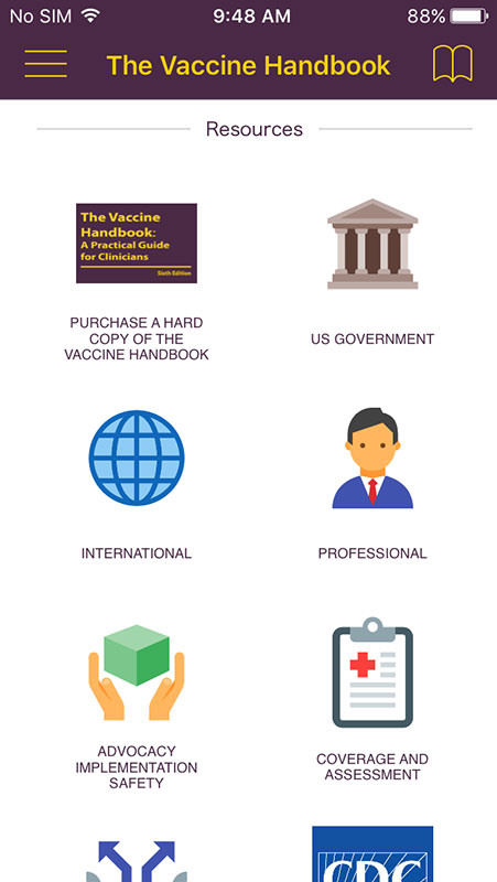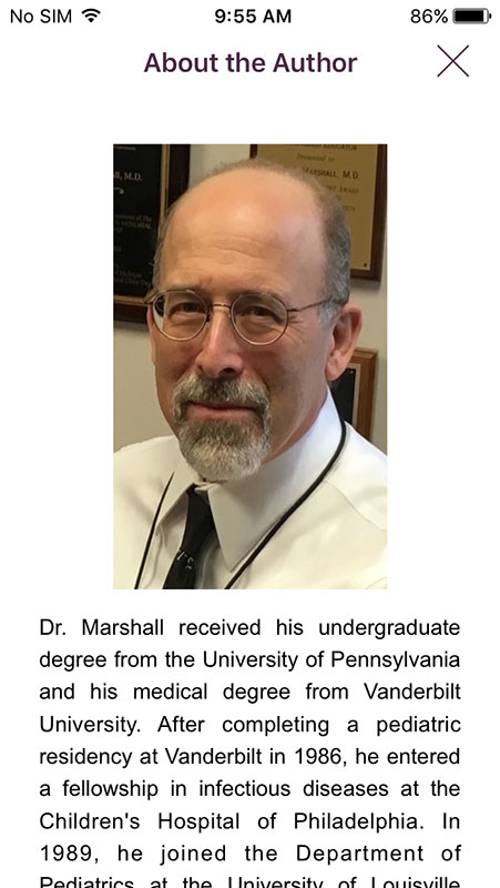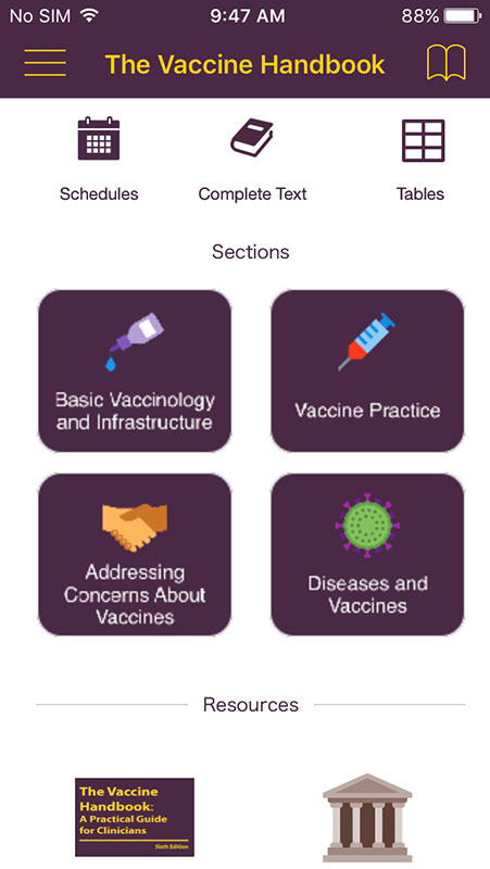 Basically, The Vaccine Handbook app contains the entire textbook from Dr. Marshall that was turned into a mobile user-friendly guide to immunizations, providing the full content along with tables and charts from the book, and links to many vaccination resources.
