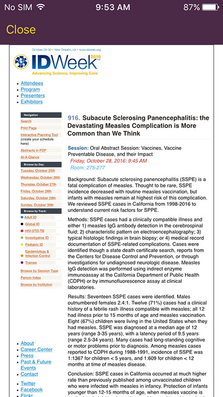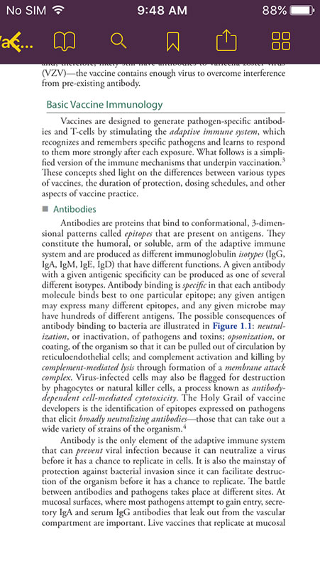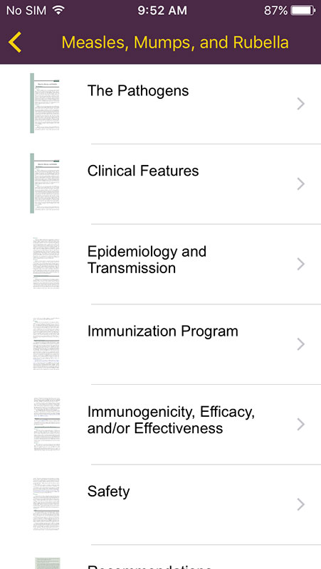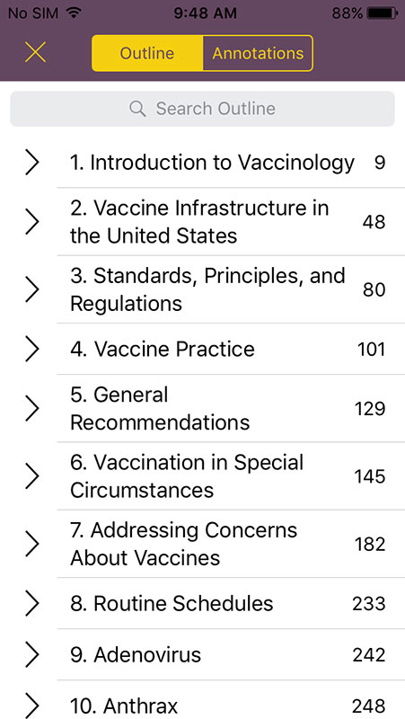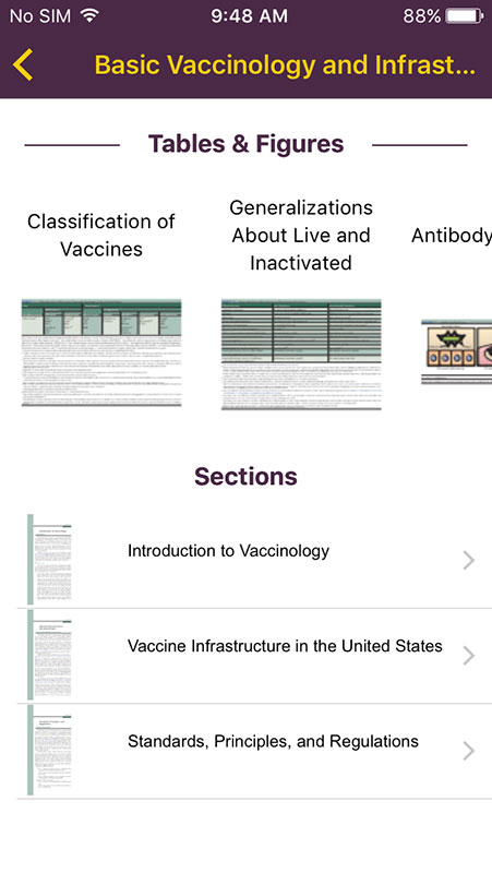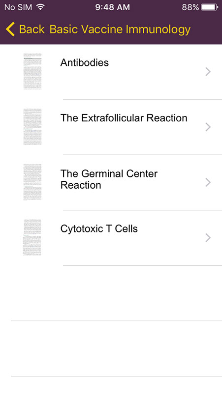 Each of the topics in all four sections comprises of chapters and sub-chapters, which cover every aspect of vaccines and immunizations. Basically, the mobile app looks like a book, except for the navigation that is adjusted for better viewing and easier navigation on mobile devices.