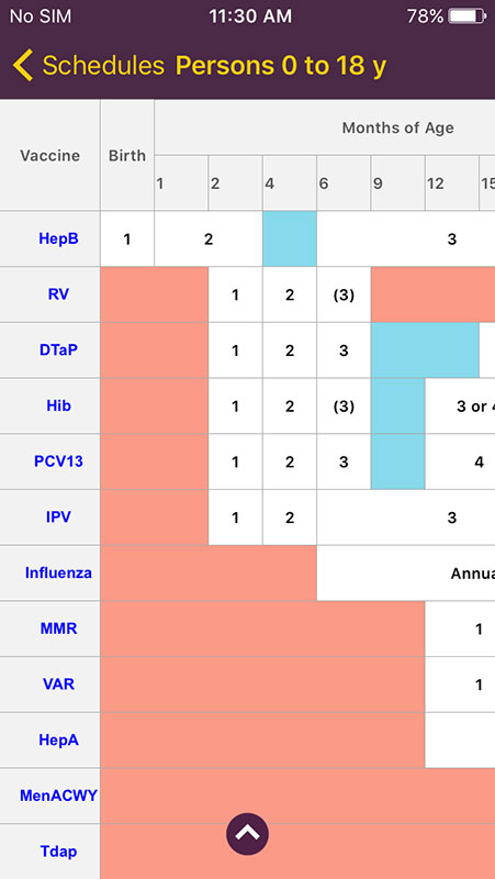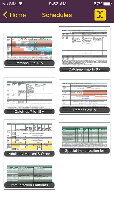 Besides viewing the content by chapters, users can also choose to read the complete text, to view all available tables, and view official CDC immunization schedules for different age groups. Schedules list all licensed vaccines which are linked with the app content explaining the particular vaccine.