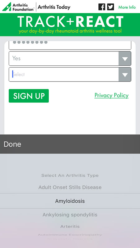 The registration can be done in the app by providing basic information, such as name, email, and password. Users also need to indicate if they have arthritis, and if so, which type.