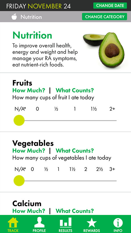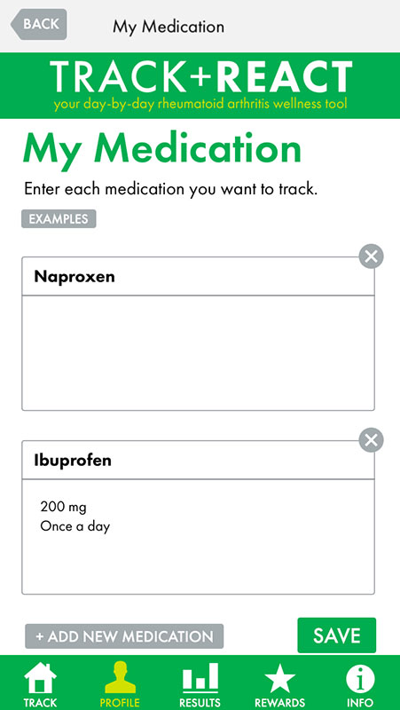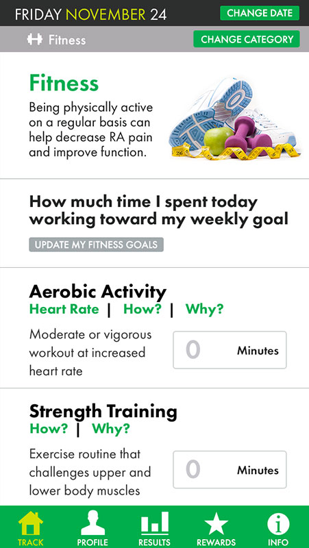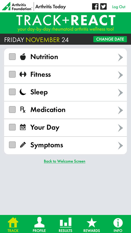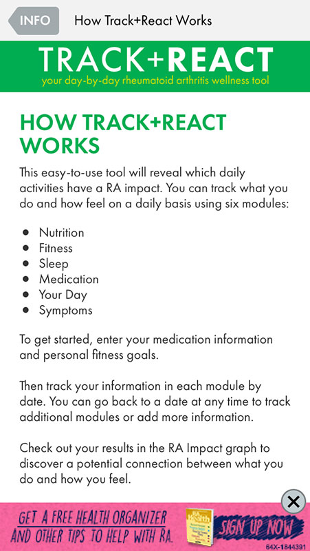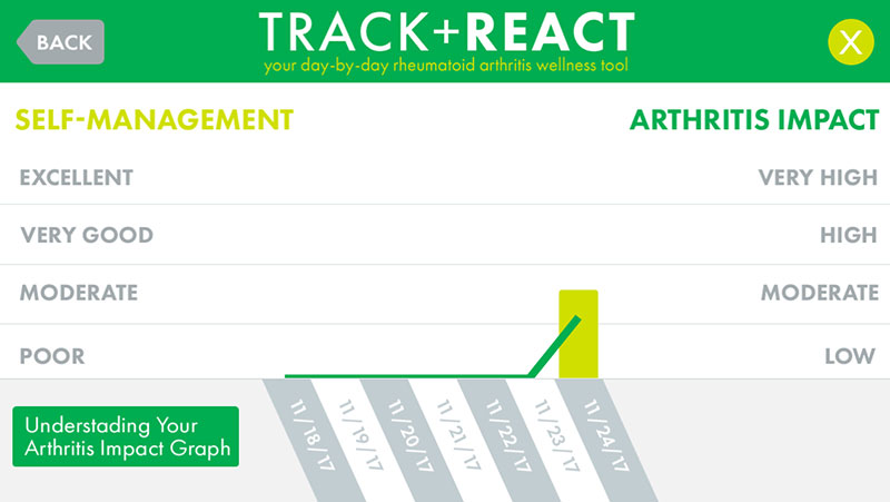 Basically, TRACK + REACT works like any other tracker app, allowing users to keep track of their nutrition, fitness, sleep, medications, day (stress, social interaction, etc.), and symptoms, and see if some of these activities are responsible for causing your arthritis pain to flare up.