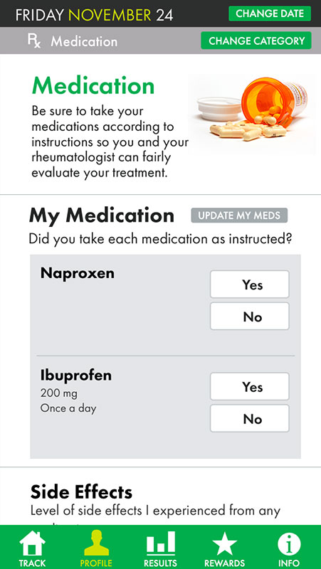 After entering all your medications, you'd see Yes and No buttons, allowing you to indicate if you took your meds as instructed and if you've experienced any side effects.