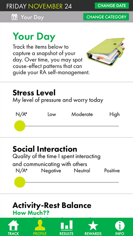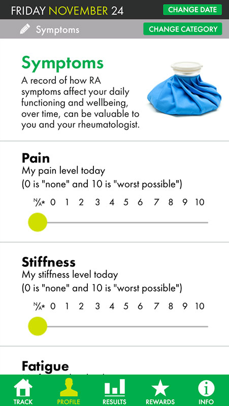 Finally, you can indicate daily symptoms by choosing one number on a scale from 0 to 10 for Pain, Stiffness, and Fatigue, or on a scale from Very Good to Very Poor for Mood and Joint Function.