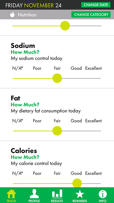 Users can also add the daily intake of sodium, fat, and calories, but there are no numerical values assigned to these categories. Instead, users need to select one of the choices, from Poor to Excellent to describe how satisfied they are with the particular nutrient intake, which, honestly, isn't the best solution for this.