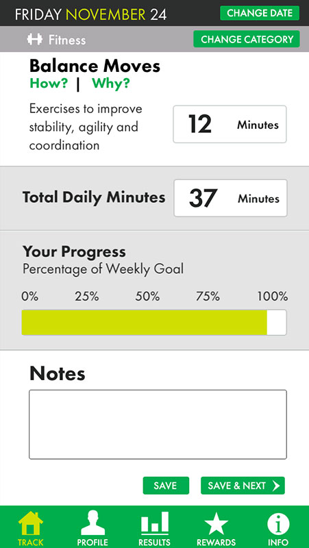 In Fitness category, users can set a number of minutes they spent performing aerobic activities, strength training, flexibility routine, and balance movies, and view their progress (percentage of weekly goals).