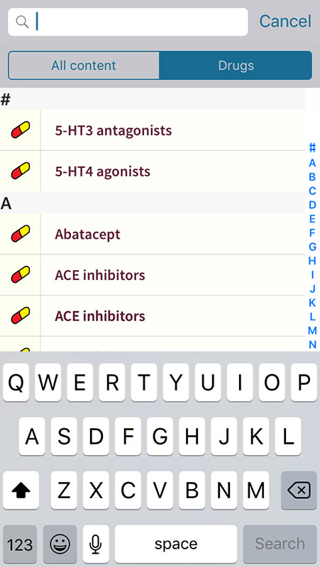If you still have trouble with the navigation, you can use the Search option, which is really powerful and fast feature, allowing you to search through all the content or specifically for certain drugs.