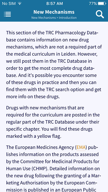 The TRC app covers most common drugs prescribed across Europe. The new drugs, which are not required part of Leiden medical curriculum, are also covered in great detail within New Mechanisms section.