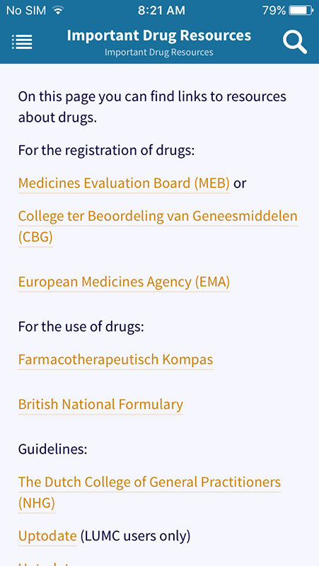 All articles are well referenced, containing links that, by default, link to the Dutch drug reference website (Farmacotherapeutisch Kompas), but this preference could be changed under 'Settings', where users can choose British National Formulary (BNF) or Micromedex database instead.